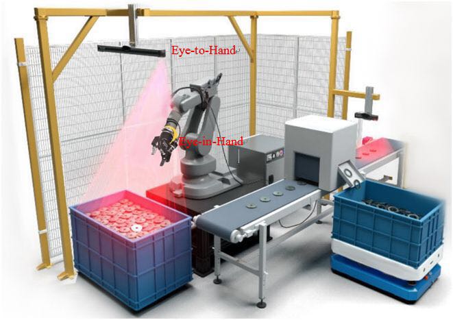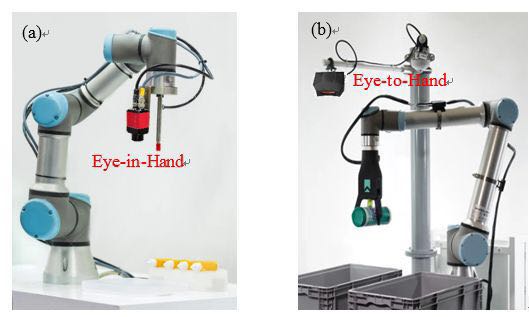 根據(jù)成像單元安裝方式不同,機(jī)器人手眼系統(tǒng)分為兩大類:固定成像眼看手系統(tǒng)(Eye-to-Hand)與隨動成像眼在手系統(tǒng)(Eye-in-Hand, or Hand-eye),如下圖1所示。
