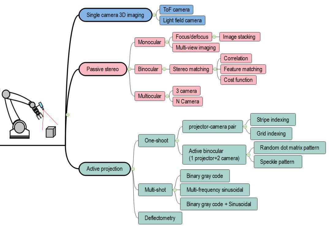 在智能制造領(lǐng)域,機(jī)器人視覺主要被用來代替人工視覺和拓展人工視覺的功能,高效、快速、準(zhǔn)確地完成測量、檢測、識別、定位等任務(wù),而這些任務(wù)的實(shí)現(xiàn)都是基于二維或三維視覺成像完成的。合肥工業(yè)大學(xué)盧榮勝教授課題組針對智能制造領(lǐng)域機(jī)器人視覺感知中的三維視覺成像技術(shù)進(jìn)行了綜述,系統(tǒng)地總結(jié)了一些有代表性的機(jī)器人視覺成像方法的特點(diǎn),探究了機(jī)器人三維視覺成像技術(shù)的發(fā)展趨勢。