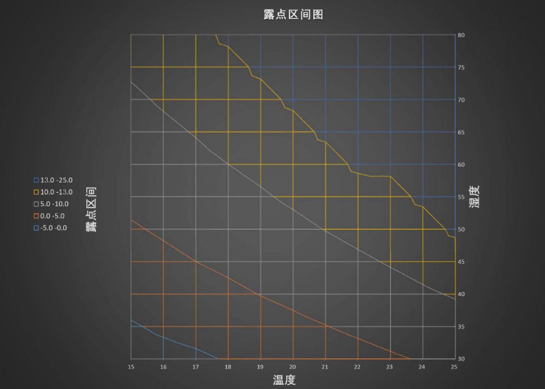 通過對比圖,首先根據所需要的溫濕度狀態(tài)點在對比圖中進行對比,這樣就能得出溫濕度狀態(tài)點對應的露點溫度。