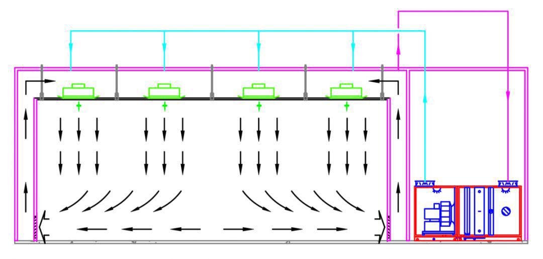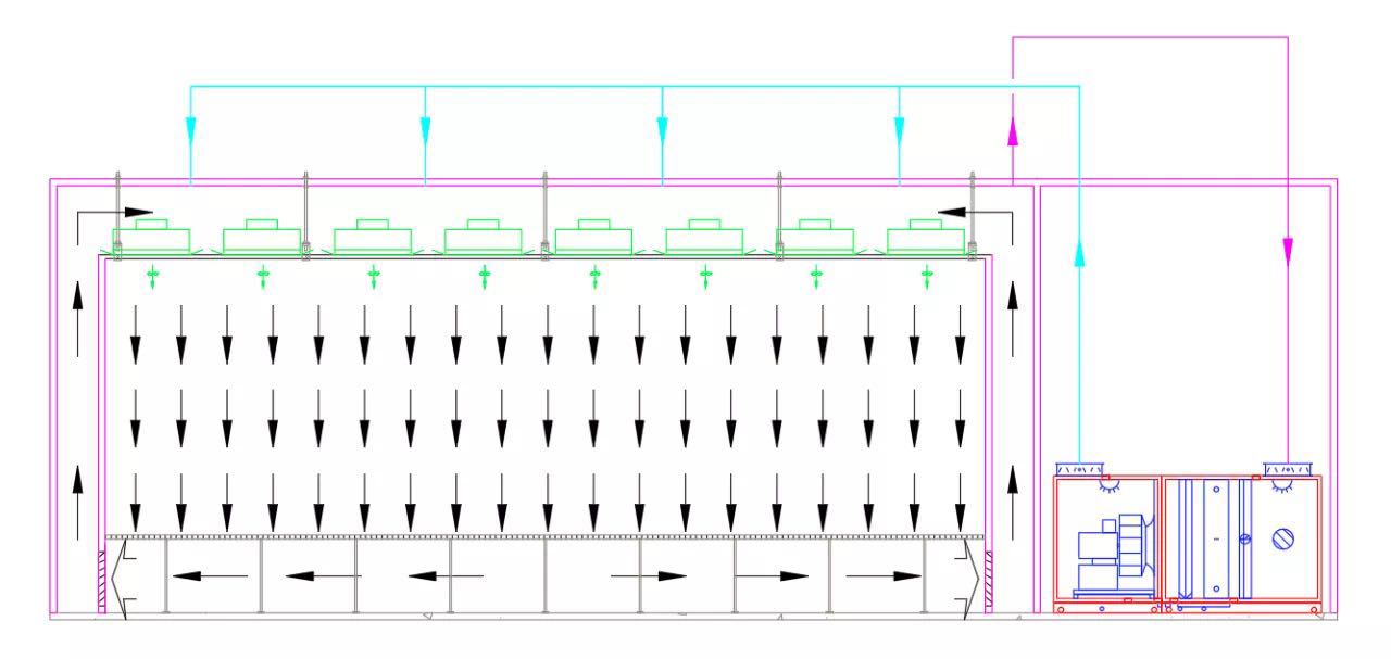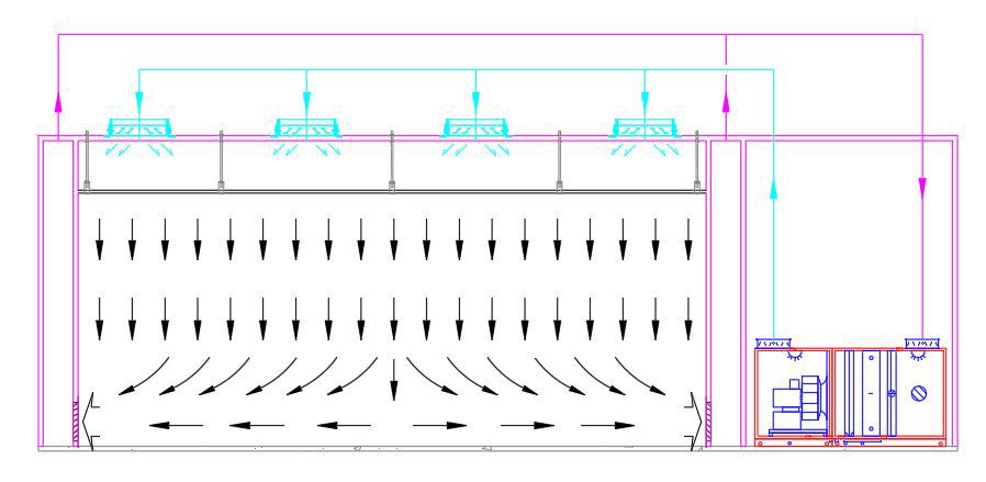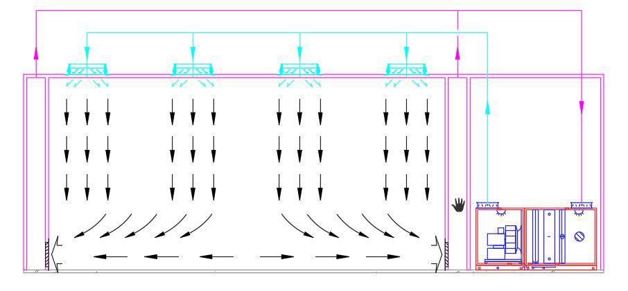 凈化空調循環(huán)送風,吊頂采用雙層結構,中間作為靜壓夾層,下層吊頂全孔板送風