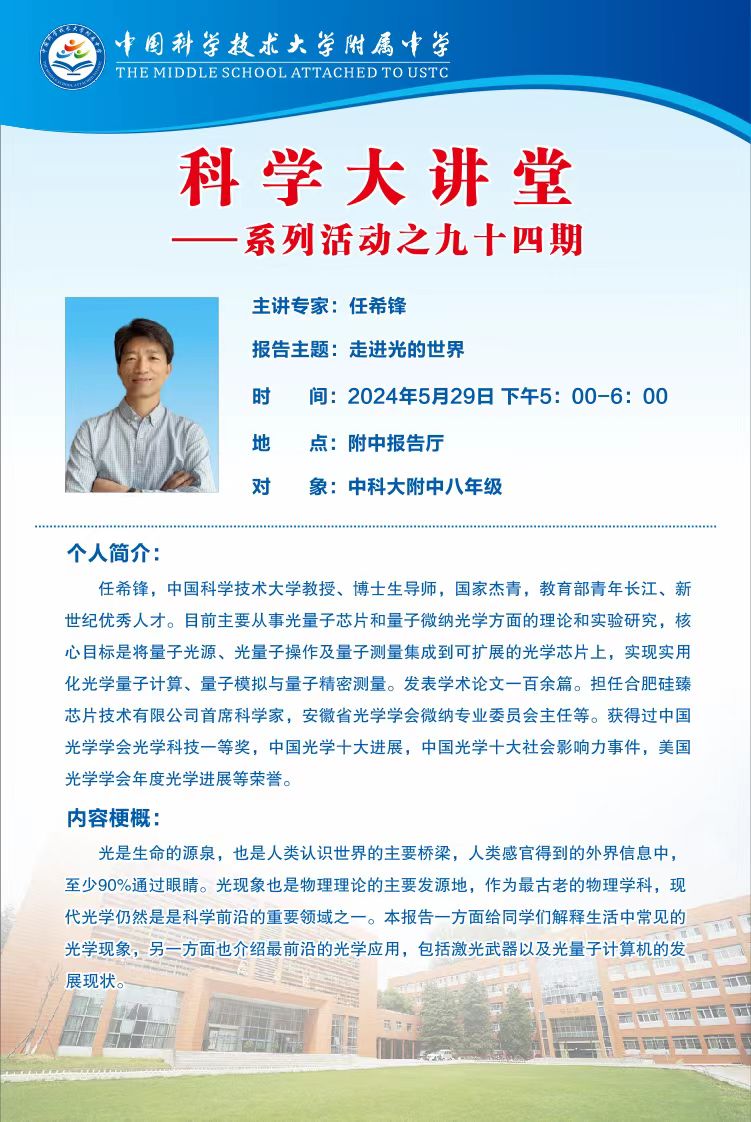 5月29日下午,由中科大附中主辦、安徽省光學(xué)學(xué)會協(xié)辦的八年級科學(xué)大講堂活動在學(xué)校報告廳舉辦。安徽省光學(xué)學(xué)會微納光學(xué)專委會主任、中國科學(xué)技術(shù)大學(xué)任希鋒教授帶來《走進(jìn)光的世界》講座。本次活動由中科大附中牛芝慧老師主持,八年級組全體同學(xué)參加。
