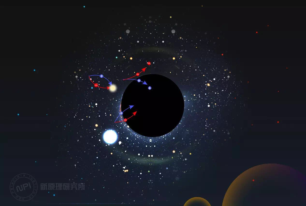 根據(jù)量子場(chǎng)論,所謂的真空并不是完全空的,而是充滿了量子漲落——虛粒子對(duì)會(huì)不斷的冒出又湮滅。當(dāng)這些虛粒子對(duì)出現(xiàn)在黑洞的事件視界附近時(shí),虛粒子對(duì)中的其中一個(gè)會(huì)被黑洞捕獲,另一個(gè)則會(huì)逃逸。落入黑洞的粒子必須擁有負(fù)能量,這樣才能保持總能量不變。而對(duì)于外部的觀測(cè)者而言,黑洞剛剛發(fā)射了一個(gè)粒子。