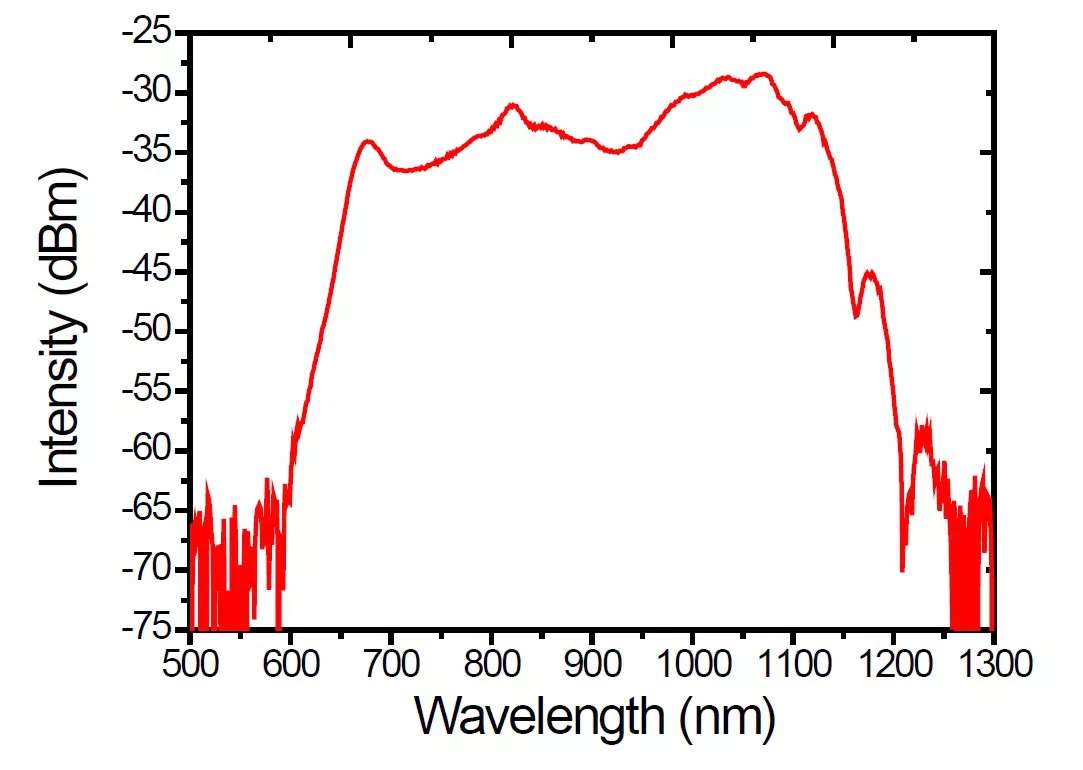中科院物理研究所L07魏志義老師組張青師姐做的倍頻程鈦寶石振蕩器光譜[1](覆蓋600-1250 nm超寬范圍):