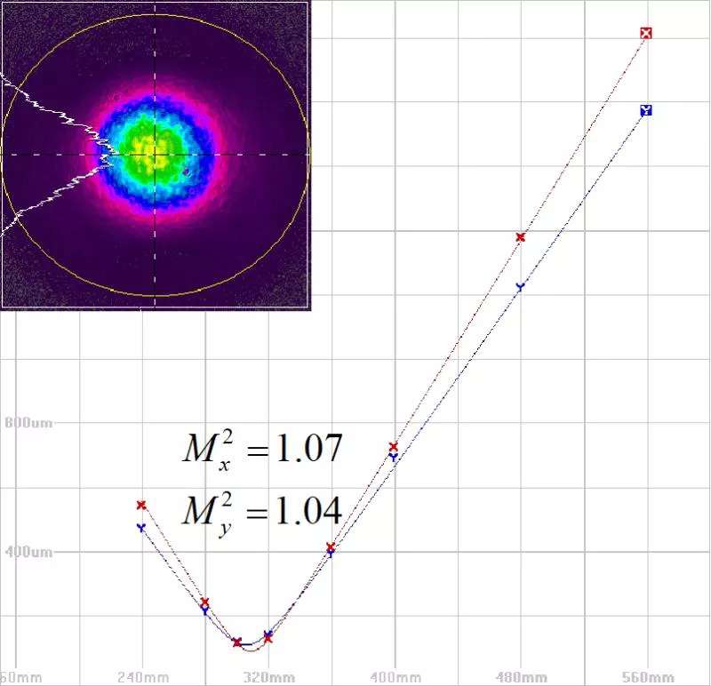 我們知道有個(gè)專門的指標(biāo)M2因子來描述激光的光束質(zhì)量,對于光束質(zhì)量好的M2可以做到略大于1,接近衍射極限,比如我們武漢華族激光有限公司[5]何會(huì)軍博士開發(fā)的Yb全固態(tài)飛秒再生放大器的M2:
