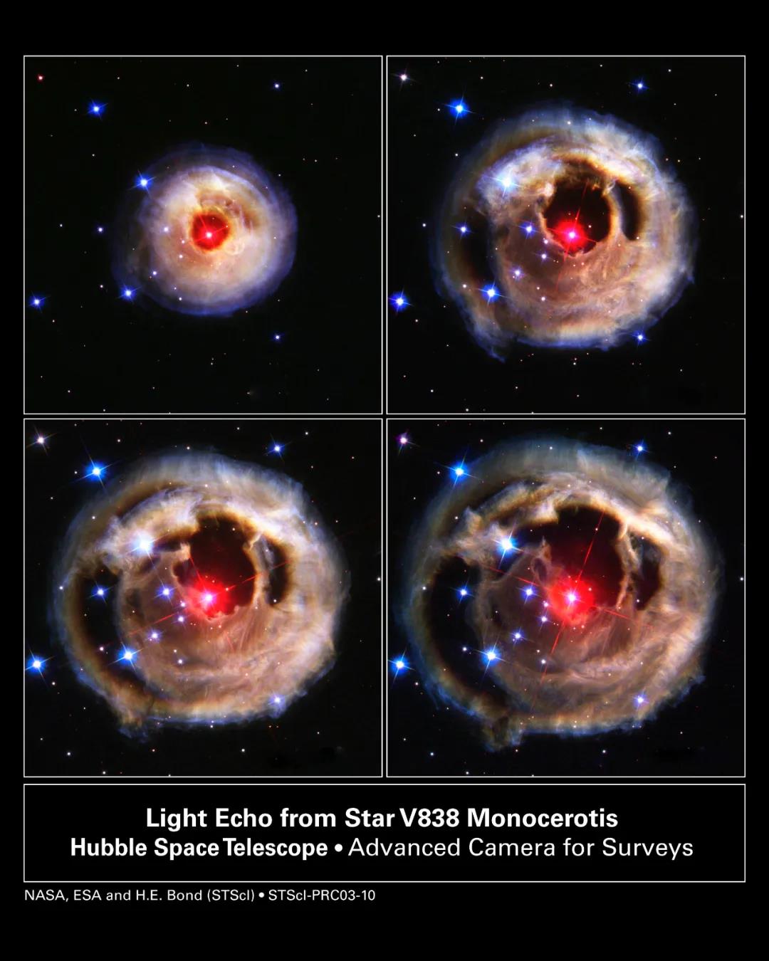 2002-2005年哈勃空間望遠鏡拍攝的麒麟座V838爆發(fā)事件過程。/ NASA