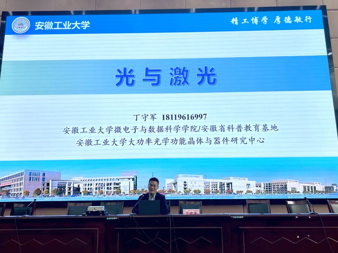 本次活動(dòng)邀請(qǐng)到我會(huì)青年專家、安徽工業(yè)大學(xué)微電子與數(shù)據(jù)科學(xué)學(xué)院的丁守軍副教授,他長(zhǎng)期致力于光學(xué)領(lǐng)域的研究與教學(xué)工作。丁教授帶來(lái)了“光與激光”主題講座,引領(lǐng)同學(xué)們開(kāi)啟了一段奇妙的科學(xué)之旅。
