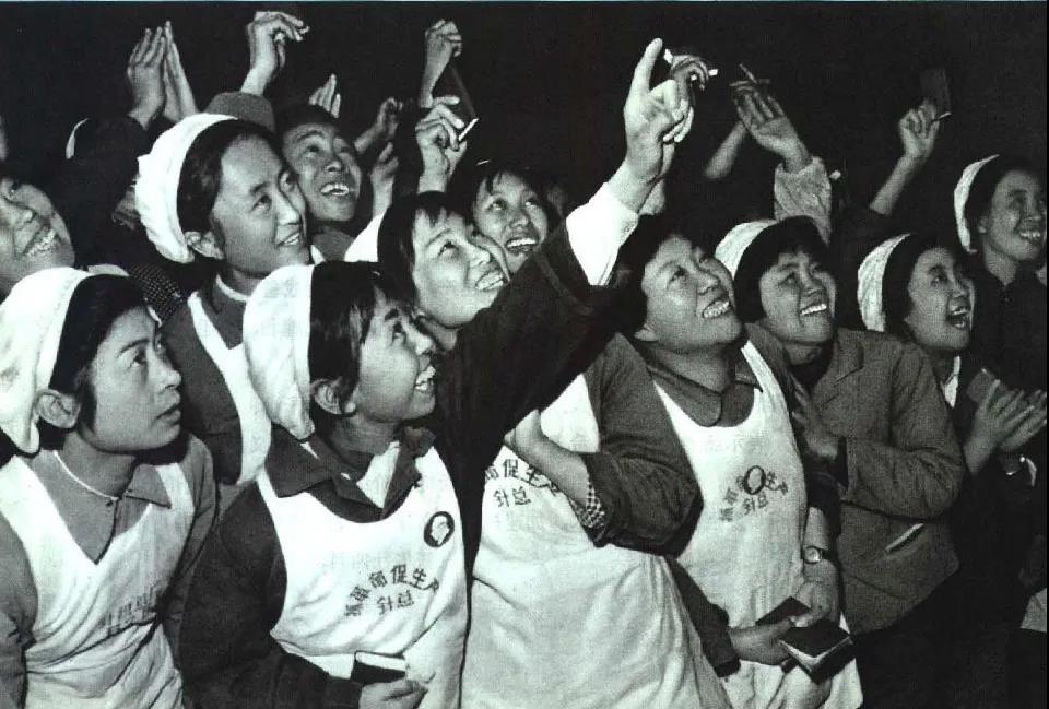 圖1是1970年4月25日晚上,北京針織總廠的工人在爭相觀看經(jīng)過天安門上空的“東方紅一號”衛(wèi)星,興奮、喜悅洋溢在她們臉上。
