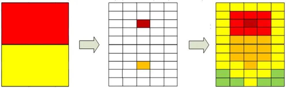 為了提高圖像的分辨率,采用能夠提供最優(yōu)線性無偏估計(jì)的Kriging插值。根據(jù)空間分辨率的需求,選擇插入的像素個(gè)數(shù),在保證同等面積范圍內(nèi)污染物濃度相等的條件下,根據(jù)煙羽擴(kuò)散模型和克里金插值對(duì)分解出的每個(gè)像元進(jìn)行濃度插值,示意圖如圖2所示。